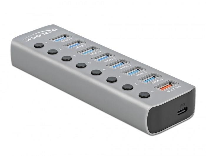 DeLOCK External USB 5 Gbps hub z 13 portami + przełącznik, USB 3.2 Gen 1 (3.1 Gen 1) Type-B, USB 3.2 Gen 1 (3.1 Gen 1) Type-A, 5000 Mbit/s, szary, alu