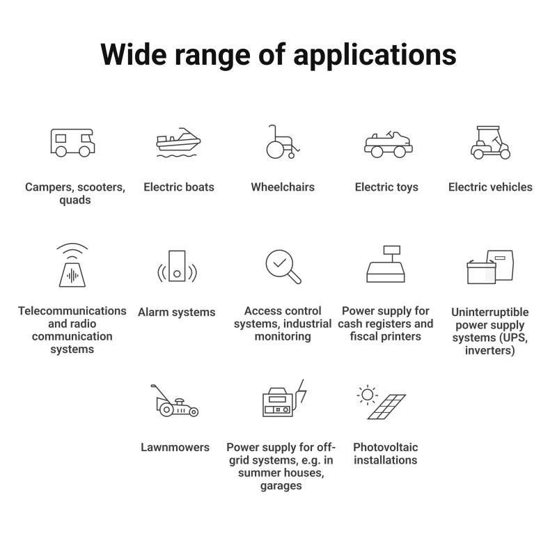 Zamień ciężkie akumulatory kwasowo-ołowiowe na lżejsze i gwarantujące znacznie większą żywotność akumulatory LiFePO4. Oferują one wyższą gęstość energii, co sprawia, że są idealnym rozwiązaniem do szerokiej gamy zastosowań, takich jak: