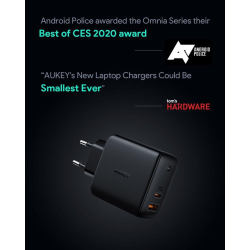 Ładowarka GAN Aukey PA-B3 Aukey Omnia PA-B3 65 W to najwyższy standard ładowania, który stanowi prawdziwą rewolucją w świecie ładowarek sieciowych. Doskonale nadaje się nie tylko do ładowania smartfonów, ale też wszelkich innych urządzeń, włącznie z laptopami. Ładowarka wyposażona jest w dwa porty USB-A i USB-C o łącznej mocy 65 W. Zastosowano tutaj technologię inteligentnego rozdziału napięcia pomiędzy portami, dzięki czemu ładowanie urządzeń jest jeszcze bardziej efektywne. Niewielkie rozmiary sprawiają, że jest zaskakująco poręczna. A jej możliwości są ogromne! Ładowarka sieciowa Aukey Omnia Mix 65 W wyposażona jest w innowacyjną technologię GaNFast, która pozwoliła na stworzenie nowatorskiej ładowarki o imponujących możliwościach. Dzięki zastosowaniu azotku galu (GaN), całkowicie nowego materiału półprzewodnikowego, ładowarki GaN mogą działać nawet 100 razy szybciej niż takie, które w układzie mocy posiadają tradycyjny krzem. Aukey Omnia posiada także cenione rozwiązanie Dynamic Detect, która pozwala na bardziej elastyczne dostarczanie energii do urządzenia. Wszystko to sprawia, że Omnia zaskakuje swoimi możliwościami i efektywnością. Przekonaj się, jak wygląda przyszłość ładowania dzięki najbardziej nowoczesnym technologiom Aukey!