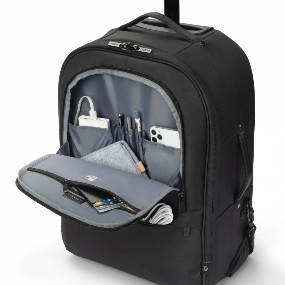 Dzięki dużej przestrzeni do przechowywania wynoszącej 33 litry plecak na kółkach Eco CORE oferuje wystarczająco dużo miejsca na codzienne potrzeby. Komora na notebooka, wyściełana pianką o wysokiej gęstości (HDF), bezpiecznie chroni laptopa, a pojemna komora główna z praktycznymi przegrodami ułatwia organizację dokumentów i akcesoriów. Przednia kieszeń jest specjalnie zaprojektowana na akcesoria mobilne, a kieszeń zapinana na zamek zapewnia miejsce do przechowywania zasilacza i kabli. Ukryta komora na lokalizator GPS pozwala mieć plecak cały czas na oku, a kieszeń zapinana na zamek z blokadą RFID chroni dane osobowe przed nieautoryzowanym dostępem. Wygodnie chowane paski naramienne umożliwiają szybką zmianę funkcji plecaka na wózek. Praktyczne, oszczędzające miejsce kieszenie boczne oferują dodatkową przestrzeń do przechowywania parasola lub butelki z wodą, a materiał hydrofobowy chroni plecak i jego zawartość w przypadku nieoczekiwanych zmian pogody.