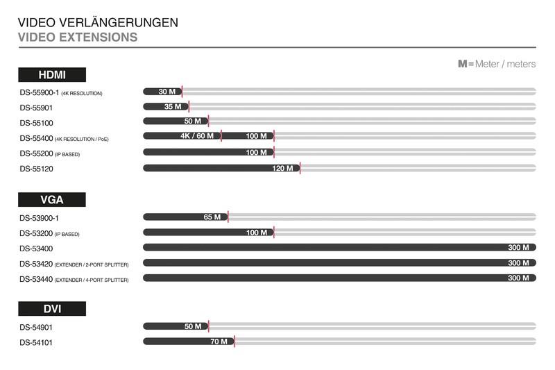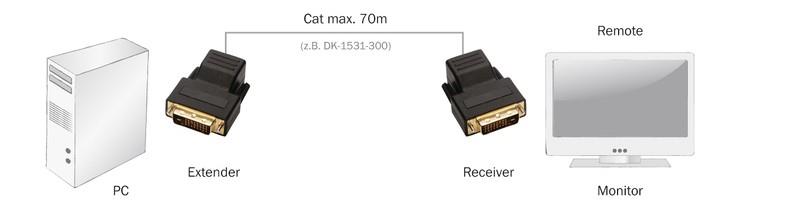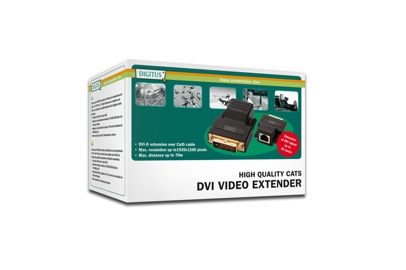 Extender DVI umożliwia transmisję sygnałów DVI do 70 metrów wykorzystując kable kat.5 jako medium transmisyjne. Rozdzielczość uzależniona jest od długości toru transmisyjnego.