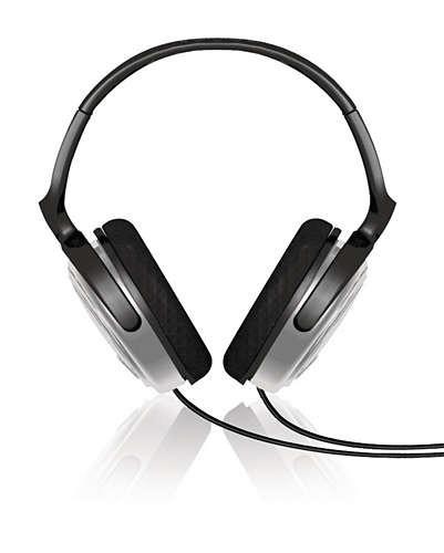 Pełnowymiarowe słuchawki do sprzętu HiFi i telewizora z reflektorem akustycznym zwiększającym jakość niskich tonów.