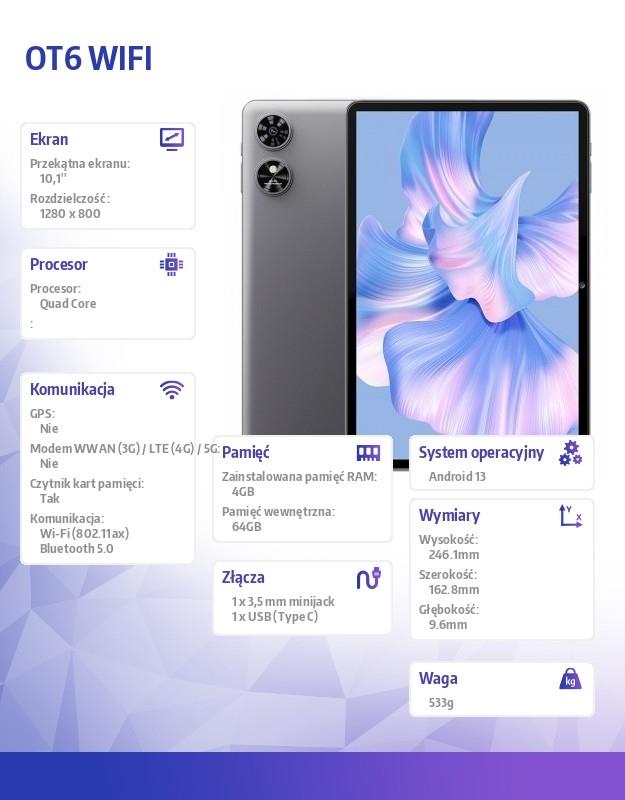Tablet Oukitel wyróżnia się obsługą nowoczesnego standardu Wi-Fi 6, zapewniając szybsze prędkości połączenia, większą przepustowość i lepszą efektywność w gęstych sieciach Wi-Fi, co jest kluczowe dla płynnego strumieniowania treści, szybkiego przeglądania internetu oraz niezakłóconej pracy online. Ponadto, z Androidem 13 jako systemem operacyjnym, tablet oferuje użytkownikom najnowsze funkcje i ulepszenia w zakresie prywatności, bezpieczeństwa oraz personalizacji, umożliwiając dostosowanie urządzenia do indywidualnych preferencji. Ta kombinacja nowoczesnego połączenia internetowego i zaawansowanego systemu operacyjnego czyni tablet Oukitel idealnym wyborem dla osób poszukujących urządzenia gotowego na wyzwania nowej ery cyfrowej.